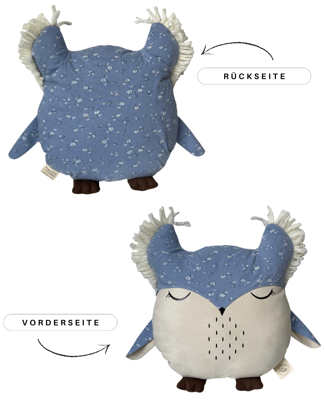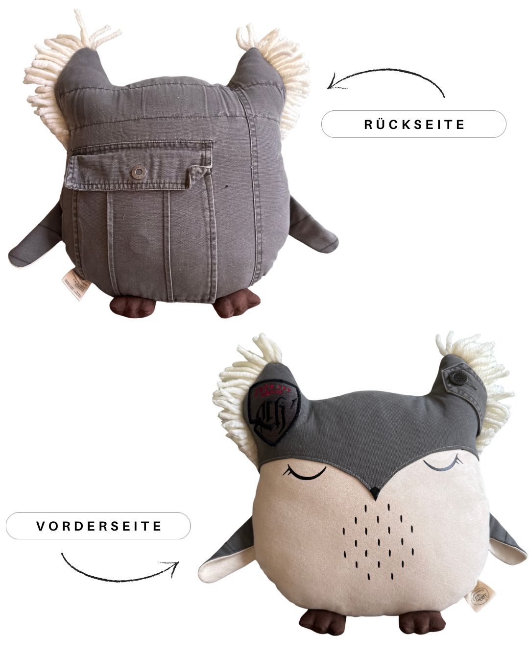 Diese besondere Eule wird individuell für dich gefertigt und trägt sichtbare Elemente aus deiner eingesendeten Kleidung. So entsteht ein persönliches und emotionales Erinnerungsstück, das für immer bleibt.