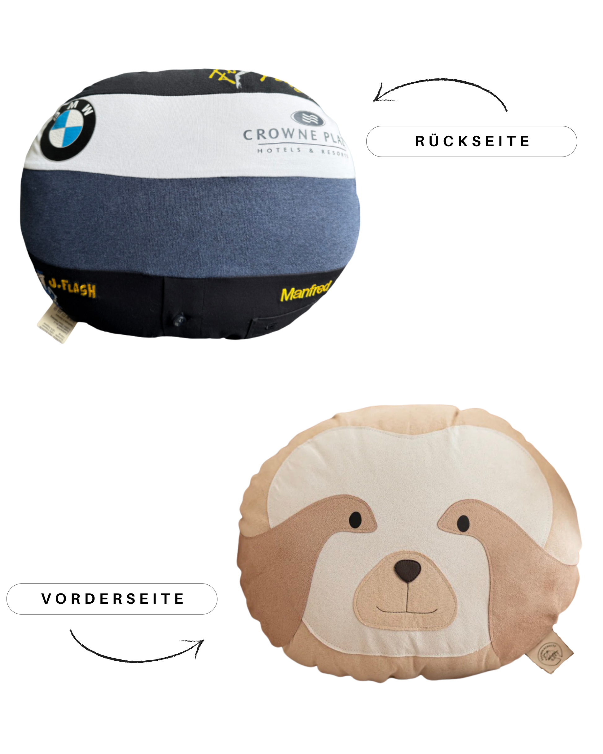 Die Rückseite wird ganz individuell aus deiner Kleidung gefertigt, ein Erinnerungsstück, das Persönlichkeit und Geschichte trägt.